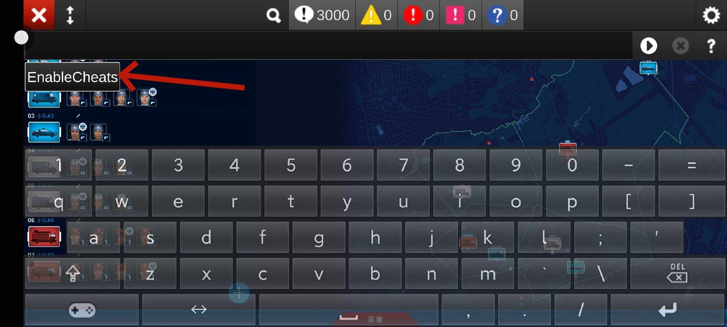 1.进入游戏后,按手机的【音量+键】调出游戏键盘,如何按一下键盘上的反斜杠键(\)即可调出作弊栏(如下图)