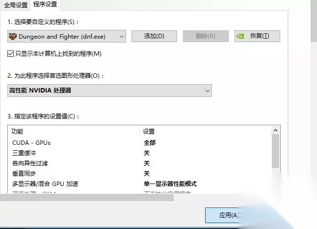 玩家可以打开任务管理器,观察DNF运行的时候,CPU和内存的占用,80%以下的基本上没毛病,内存和CPU不是限制你DNF卡顿的原因。 3.硬盘 硬盘主要分为机械硬盘和固态硬盘。它们两个速度差的很远基本都是3倍多以上。如果你DNF的FPS不低,但就是走在街上会一卡一卡的或者阶段性的卡屏,那可以考虑换一个固态硬盘。思念之前就是用了各种设置,都没有用,FPS不低,但就是一卡一卡的,最后换了固态硬盘直接DNF就起飞了。之前不敢上擎天,怕卡没有输出,现在一点没问题。 二、软件: 1.DNF外设置 ①开启显卡 打开NVIDIA控制面板,把DNF设置成独显