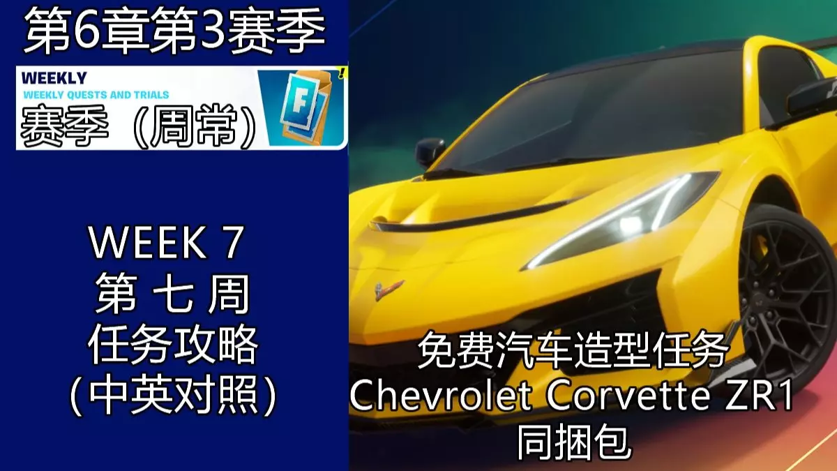 相关游戏:堡垒之夜 完成“组队-夏日公路旅行”,获得Chevrolet Corvette ZR1同捆包! C6S3第七周周常任务攻略 任务3.击败大吾BOSS或…