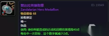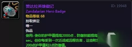 名称:赞达拉英雄徽记 唯一 饰品 护甲值提高2000点,防御技能提高30点,持续20秒。每受到一次近战或者原创伤害则加成降低200点护甲值和3点防御值(最多十次伤害) 适合职业:战士、圣骑士等防御职业。