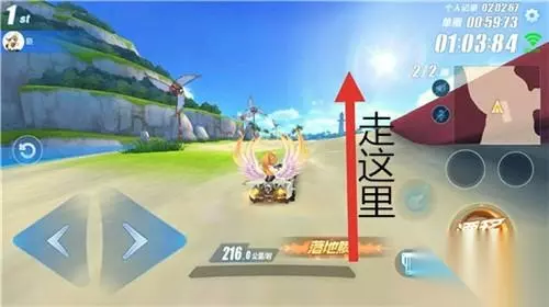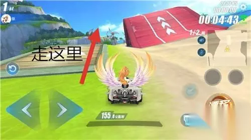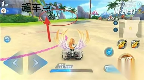 【超车点2】 通过木板路后,会落入水中,这里选择走偏向右边的道路(如下图),这样可以再次完成一次小飞跃,进行两次小喷。 注意:千万不要撞到拱桥,否则会退回水中,并且停在水中,这样就只能点击左方的归位键重新归位,会浪费很多时间。