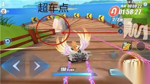 【超车点1】 开局,车手会遇到一个红色的拱桥,拱桥坡度太高,会使赛车失去大量速度,因此走拱桥左边。拱桥左边的木板路才是最佳道路(如下图),赛车从此处通过将会进行一次飞跃,可以使用两次小喷,是开局的最佳道路。而在第二圈的时候,如果经过这里是有一个氮气的话就可以直接走拱桥,毕竟使用氮气飞跃得更远。