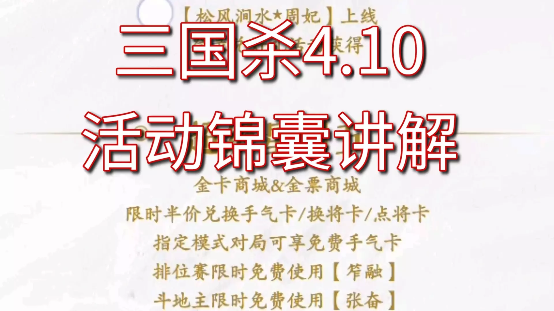 三国杀手杀移动版4.10活动官宣,谋高顺加入秒杀获取,该武将为之前的盒子精品,排位将池可用,但本次秒杀性价比一般;同时还有周妃皮肤可通过签到活动获取,另有活动盒子返场新皮肤。
