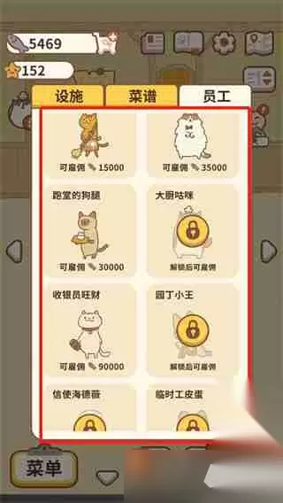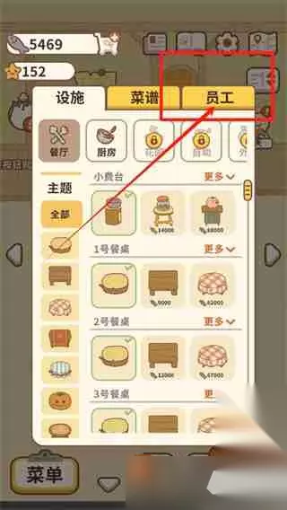 2、在商店页面,选择上方的分类,有设施、菜谱和员工等,点击查看员工分类。