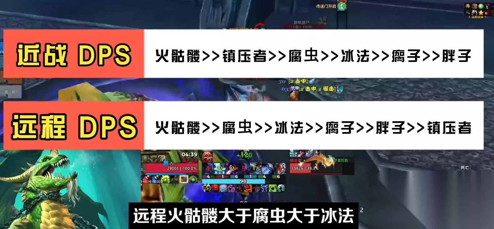 一、镇压者 这种小怪他们眼里只有绿龙,刷新后会直接跑向boss对其施放抑制技能,减少目标受到的治疗效果10%可以叠加。 二、贪食的憎物 简称胖子,皮糙肉厚替第一时间建立仇恨拉住,注意胖子死以后会刷新8个蛆虫,需要坦克拉住第一时间a掉, 三、附生的法师 简称冰法怪物,模型跟巫妖一样技能是读条的群体寒冰剑,必须第一时间打断。 四、灼热骷髅 简称火骷髅,技能是损毁每2秒对所有的敌人造成全团的AoE,是第一集火目标。 五、脓疮僵尸 简称瘸子,这种怪普工会对目标破甲10%可以叠加5次,需要猎人风筝一下,注意瘸子死亡以后有一个15码范围的AoE自爆,所有人必须躲开。 以上就是绿龙这场战斗一共出现的5种小怪,DPS集火的优先级如下: