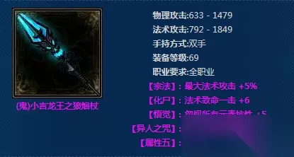 t15_2-t15_1:12.0 标签: 龙王 《新倩女幽魂》装备分为不同品级,其中鬼器装备是玩家们梦寐以求的装备。(鬼)小吉龙王之狼烟杖是一把69级鬼器品级的…
