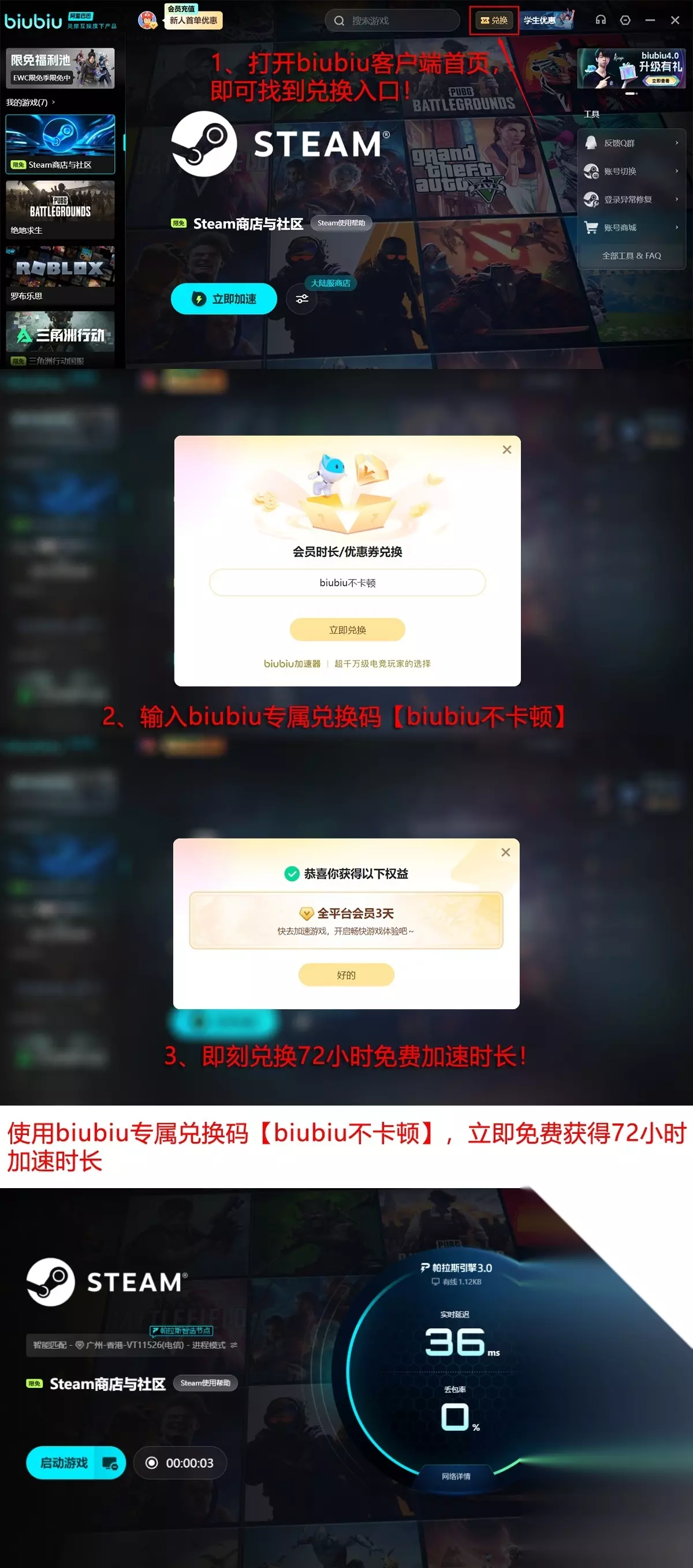 新用户注册即可获赠24小时全功能免费试用权益;完成首次登录后,输入专属兑换码【biubiu不卡顿】还可额外领取72小时加速时长,累计享有96小时无限制体验。该权益覆盖所有主流PC及移动端游戏场景,支持包括《原神》《崩坏:星穹铁道》《绝地求生》《Apex英雄》等在内的数百款国内外热门作品。