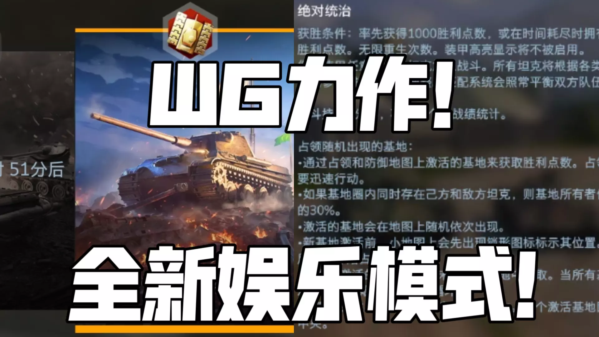 全新娱乐模式“绝对统治”现已上线! 还没体验I级坦克与X级坦克激情对线?还没体验惊险刺激的基地占领? 全新娱乐模式“绝对统治”给予全新游戏体验,任何等级的任何坦克均可参与同一场战斗,您的任务不仅是占领基地,还要守住它,击退任何企图染指基地的敌人! 还没体验“绝对统治”娱乐模式的车长们,快来体验吧!