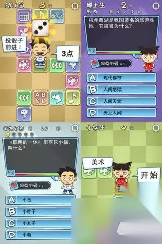 进入游戏后,你需要创建一个角色,此后将开始你的学业生涯。学业生涯通过掷骰子进行,每走到一格时,应用将会向你提出格子上logo所代表类型的问题,每个格子中包含5个问题。每个问题会给你20秒的作答,作答过程并计分。在这个学业阶段中,当你总分达到60分时才可升学。