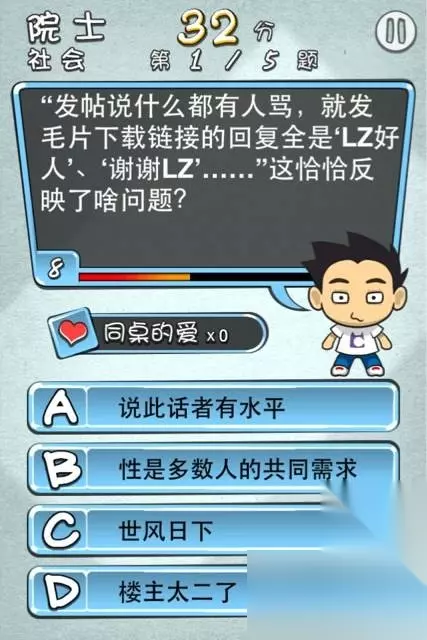 真心好难的题目,真心好纠结的答案,真心有的已经忘记的差不多了,其实app应用的题目都是日常常识性的问答,可怎么就是毕不了业了。毕不了业就算了,还没有正确答案来参考。情何以堪! 天朝教育委员会介绍 超过90个科目类别!5000多个知识性,性俱佳的问题!只要达到60分就可以开始下一等级的学业!有4种超强道具助您毕业!那么就让大家一起开动脑筋来回答问题吧!游戏的知识面,性很广。玩游戏的同时吸收一些不知道的知识。