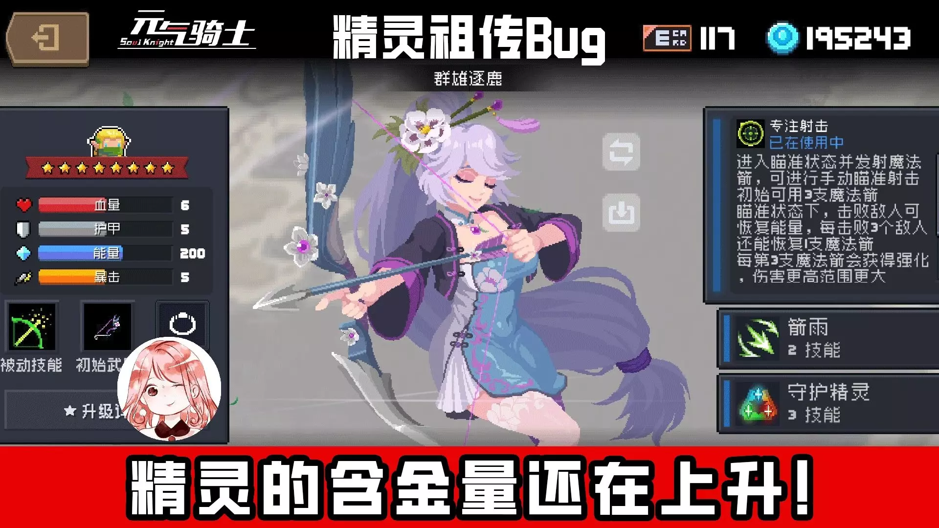 这是《元气骑士》8.1版本的游戏纪念内容,展示了精灵角色达成邪王千层挑战的界面,界面呈现了大量天赋、因子等配置,还提及解锁炸天难度的条件,记录了这一高难度挑战成果。