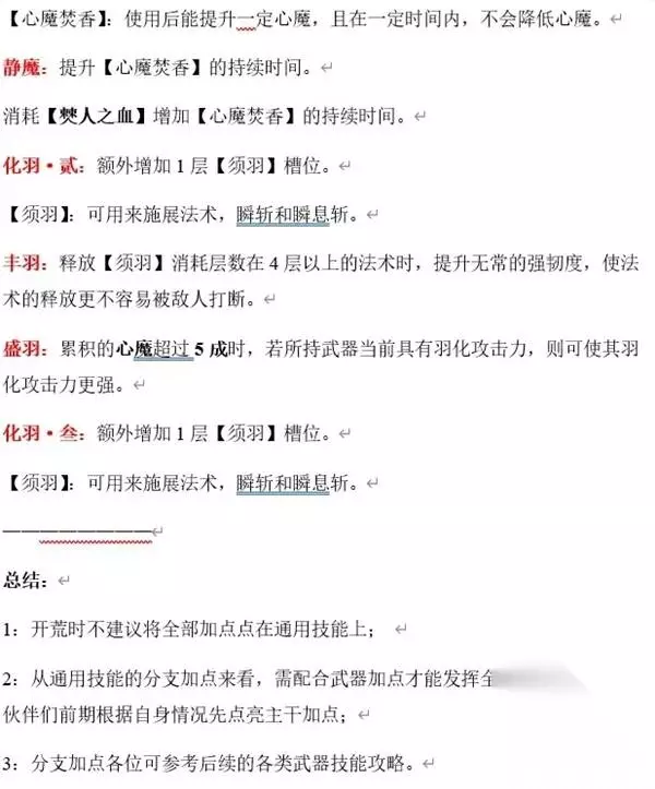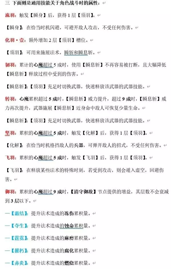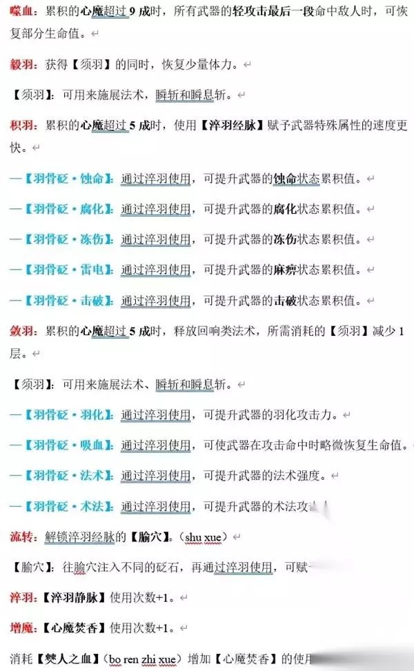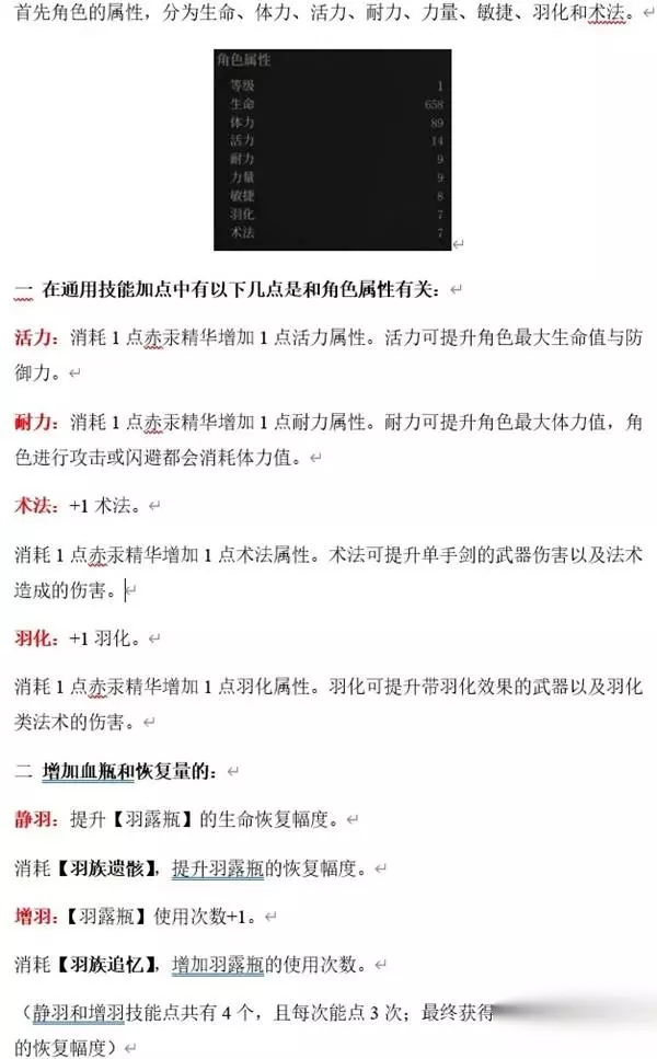 一 在通用技能加点中有以下几点是和角色属性有关: 活力:消耗1点赤汞精华增加1点活力属性。活力可提升角色最大生命值与防御力。 耐力:消耗1点赤汞精华增加1点耐力属性。耐力可提升角色最大体力值,角色进行攻击或闪避都会消耗体力值。 术法:+1术法。消耗1点赤汞精华增加1点术法属性。术法可提升单手剑的武器伤害以及法术造成的伤害。 羽化:+1羽化。消耗1点赤汞精华增加1点羽化属性。羽化可提升带羽化效果的武器以及羽化类法术的伤害。 二 增加血瓶和恢复量的: 静羽:提升【羽露瓶】的生命恢复幅度。 消耗【羽族遗骸】,提升羽露瓶的恢复幅度。 增羽:【羽露瓶】使用次数+1。 消耗【羽族追忆】,增加羽露瓶的使用次数。 (静羽和增羽技能点共有4个,且每次能点3次;最终获得12瓶羽露瓶及+12的恢复幅度) 三 下面则是通用技能关于角色战斗时的属性: 流羽:触发【瞬身】后,获得1层【须羽】。 【瞬身】:在恰当时机闪避,可避开敌人攻击,不受任何伤害。 化羽·壹:额外增加2层【须羽】槽位。 【须羽】:可用来施展法术,瞬斩和瞬息斩。 韧羽:累计的心魔超过5成时,使用【瞬息斩】不再容易被打断,且大幅降低【瞬息斩】释放过程中受到的伤害。 【瞬息斩】:【须羽】充足时切换武器,快速释放该武器的武器技能。 转羽:心魔累积超过5成时,【瞬息斩】威力提升,超过9成时,【瞬息斩】威力再次提升,武器施展【瞬息斩】近身命中敌人可恢复少量生命。 【瞬息斩】:【须羽】充足时切换武器,快速释放该武器的武器技能。 坚羽:累积的心魔超过5成时,触发【化解】后,获得1层【须羽】。 【化解】:在恰当时机格挡敌人的兵器,可弹开敌人的招式,不受任何伤害。 飞羽:累积的心魔超过5成时,触发【飞羽】后,获得1层【须羽】。 【飞羽】:在释放某些法术的特殊时刻,若受到攻击,则会遁入虚空,回避伤害。 御羽:累积的心魔超过9成时,【清守御敌】节点提供的增益,其层数不会衰减到3层以下。 —【霜结】:提升法术造成的冻伤累积量。 —【夺生】:提升法术造成的蚀命累积量。 —【霆霓】:提升法术造成的麻痹累积量。 —【摧朽】:提升法术造成的腐化累积量。 —【赤炎】:提升法术造成的燃烧累积量。 噬血:累积的心魔超过9成时,所有武器的轻攻击最后一段命中敌人时,可恢复部分生命值。 毅羽:获得【须羽】的同时,恢复少量体力。 【须羽】:可用来施展法术,瞬斩和瞬息斩。 积羽:累积的心魔超过5成时,使用【淬羽经脉】赋予武器特殊属性的速度更快。 —【羽骨砭·蚀命】:通过淬羽使用,可提升武器的蚀命状态累积值。 —【羽骨砭·腐化】:通过淬羽使用,可提升武器的腐化状态累积值。 —【羽骨砭·冻伤】:通过淬羽使用,可提升武器的冻伤状态累积值。 —【羽骨砭·雷电】:通过淬羽使用,可提升武器的麻痹状态累积值。 —【羽骨砭·击破】:通过淬羽使用,可提升武器的击破状态累积值。 敛羽:累积的心魔超过5成时,释放回响类法术,所需消耗的【须羽】减少1层。 【须羽】:可用来施展法术、瞬斩和瞬息斩。 —【羽骨砭·羽化】:通过淬羽使用,可提升武器的羽化攻击力。 —【羽骨砭·吸血】:通过淬羽使用,可使武器攻击命中时略微恢复生命值。 —【羽骨砭·法术】:通过淬羽使用,可提升武器的法术强度。 —【羽骨砭·术法】:通过淬羽使用,可提升武器的术法攻击力。 流转:解锁淬羽经脉的【腧穴】。(shu xue) 【腧穴】:往腧穴注入不同的砭石,再通过淬羽使用,可赋予武器不同的属性。 淬羽:【淬羽静脉】使用次数+1。 增魔:【心魔焚香】使用次数+1。 消耗【僰人之血】(bo ren zhi xue)增加【心魔焚香】的使用次数。 【心魔焚香】:使用后能提升一定心魔,且在一定时间内,不会降低心魔。 静魔:提升【心魔焚香】的持续时间。 消耗【僰人之血】增加【心魔焚香】的持续时间。 化羽·贰:额外增加1层【须羽】槽位。 【须羽】:可用来施展法术,瞬斩和瞬息斩。 丰羽:释放【须羽】消耗层数在4层以上的法术时,提升无常的强韧度,使法术的释放更不容易被敌人打断。 盛羽:累积的心魔超过5成时,若所持武器当前具有羽化攻击力,则可使其羽化攻击力更强。 化羽·叁:额外增加1层【须羽】槽位。 【须羽】:可用来施展法术,瞬斩和瞬息斩。 总结: 1:开荒时不建议将全部加点点在通用技能上; 2:从通用技能的分支加点来看,需配合武器加点才能发挥全部实力,所以各位伙伴们前期根据自身情况先点亮主干加点; 3:分支加点各位可参考后续的各类武器技能攻略。 我将原稿中的排版以图片形式放在下面,以方便各位明末的小伙伴们更加容易看清: