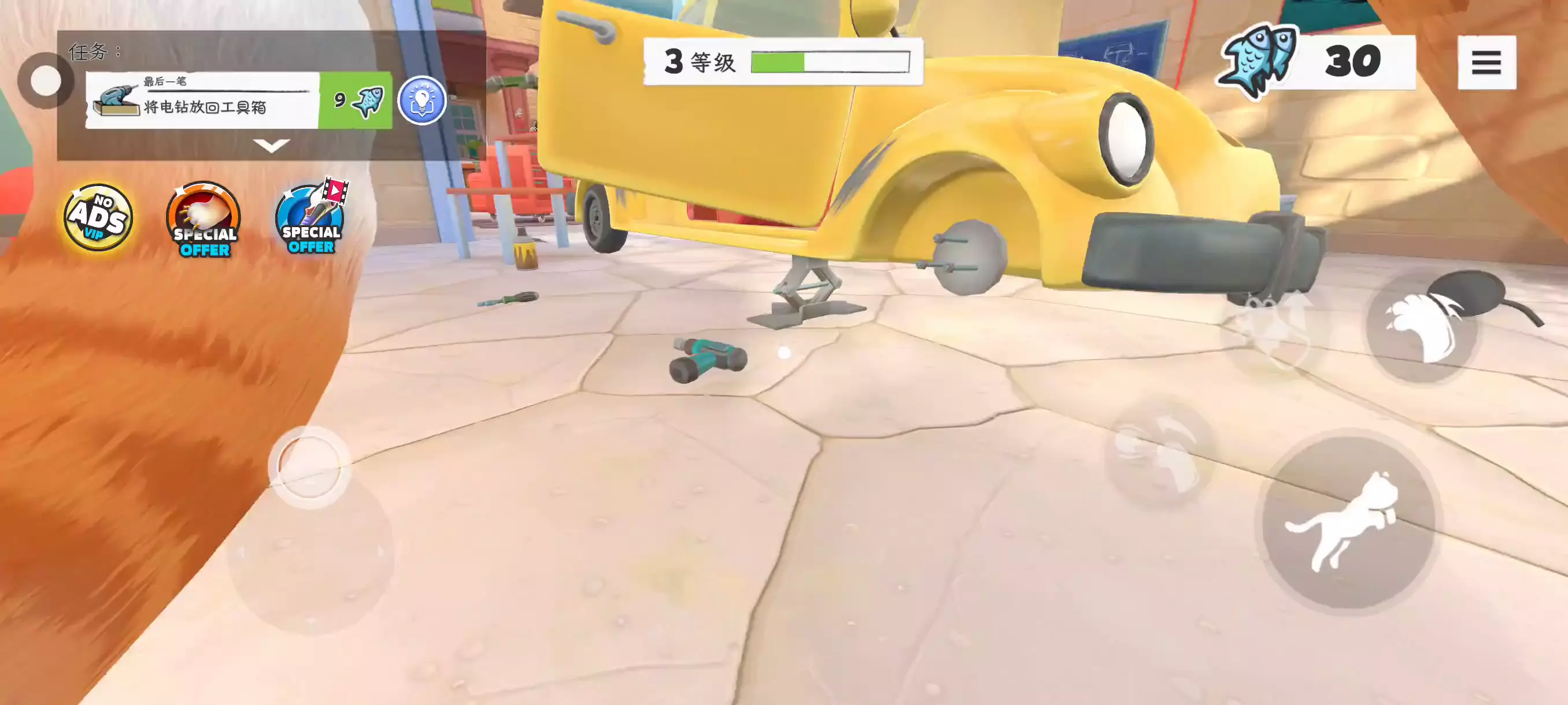 这是游戏《我是猫》的玩法内容展示,呈现了进入车库、点亮拳击场、归还电钻、安装汽车轮子等任务流程,还提及启动汽车逃离车库的相关玩法,带玩家了解游戏里的任务操作。