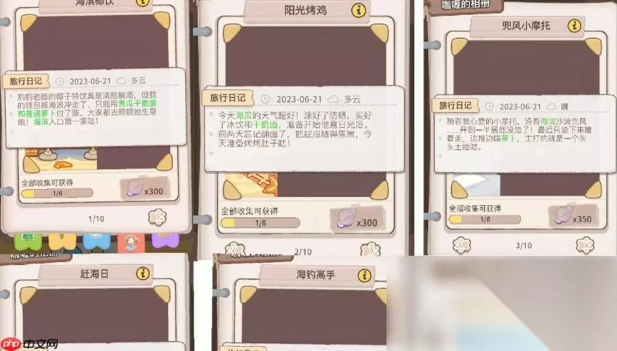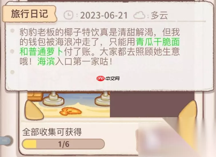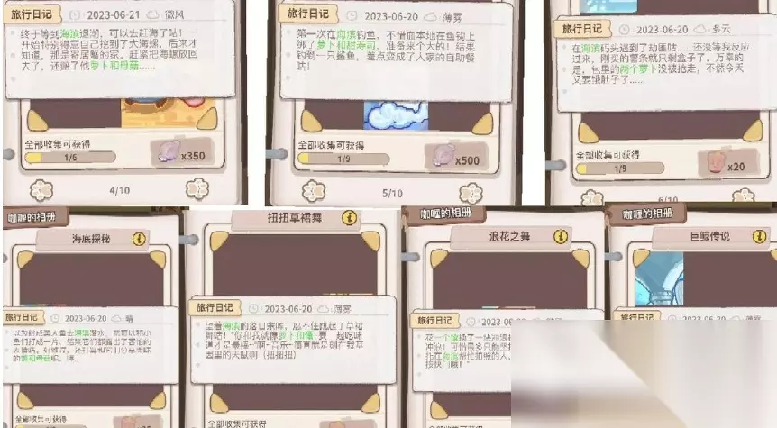 最后阶段的任务包括“浪花之舞”与“巨鲸传说”,分别要求玩家准备馕和甜寿司各一份。若能完成全部物品的收集,还将触发隐藏任务“扭扭草裙舞”。在此任务中,建议提前备好萝卜和馕,并将其分发给到场的客人们。完成这一系列互动后,你便正式打通了整个海滨地图的所有主线与支线内容,不仅可以获得象征荣誉的海滨徽章,还能达成完整的地图成就。