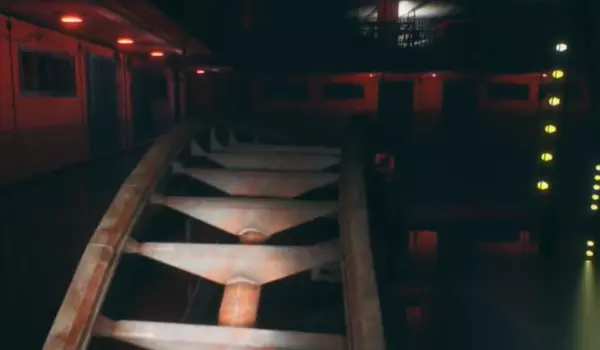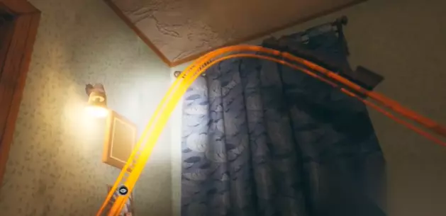 如图,走到栏杆处,爬到轨道上后,观察楼道会发现有三处荧光图案,顺着铁轨前往这三处即可获得玩具。