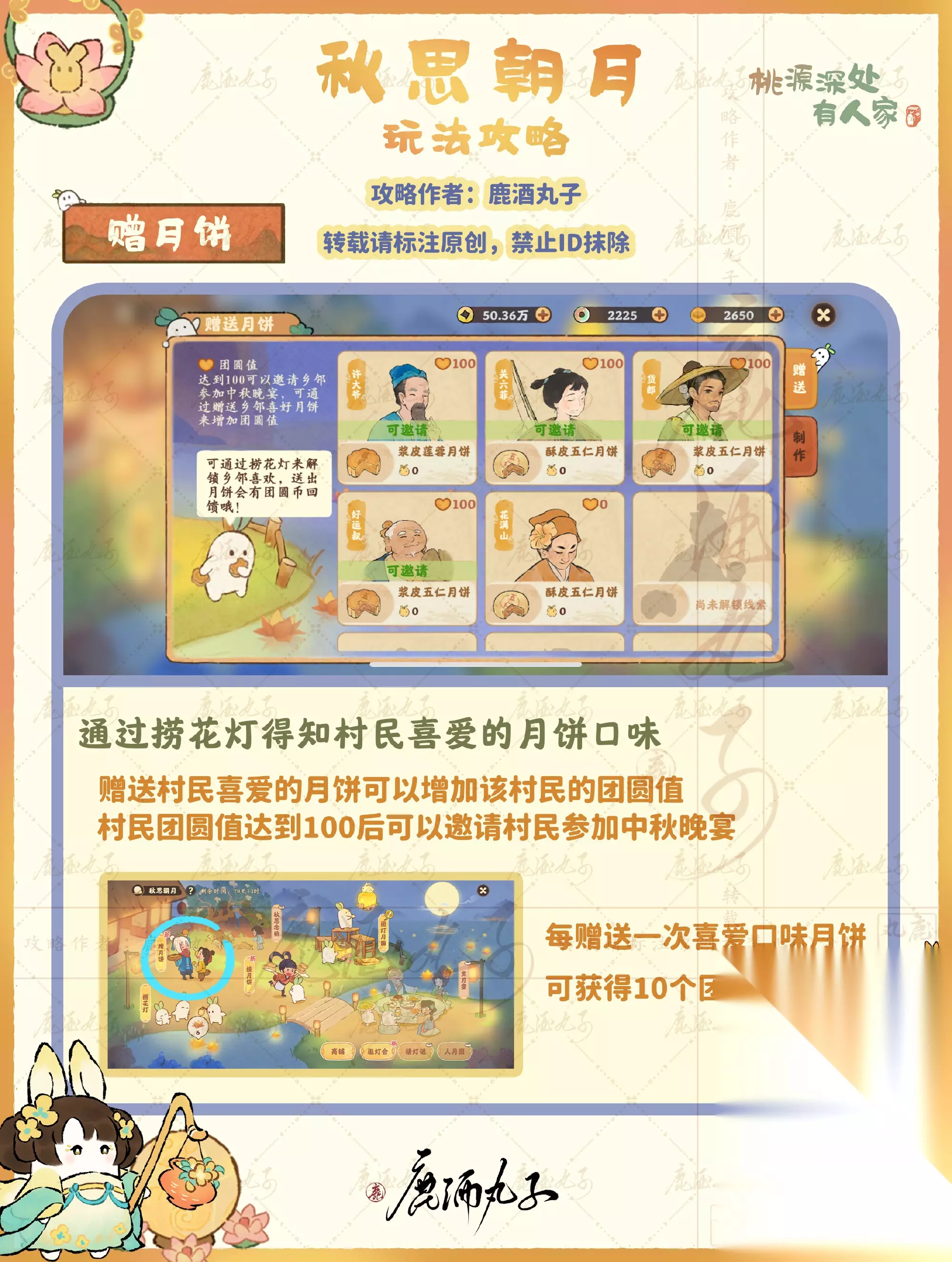 图5-赠月饼 赠送村民喜爱的月饼可以增加该村民的团圆值 村民团圆值达到100后可以邀请村民参加中秋晚宴 每赠送一次喜爱口味月饼,可获得10个团圆币