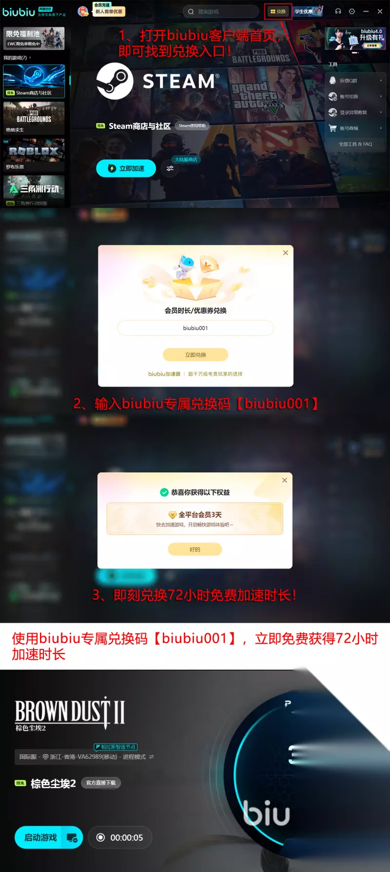 现在还有免费加速时长可以领取,不需要花一分钱就可以享受高速的加速服务。每一个人都可以通过【biubiu001】,直接领取3天的免费加速时长,这一个通用口令新老用户都可以使用,没有任何的门槛。那还有一个好消息要告诉新用户,在第1次注册登录之后,还有一个24小时的礼包。新手礼包和通用福利还可以放在一起使用,一共就能免费长达96小时,再也无需担心卡顿的问题。
