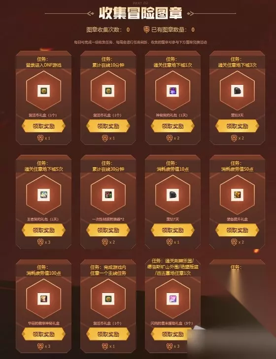 完成任务获得的图章可以用于兑换黑钻、灿烂的徽章神秘礼盒、华丽的徽章神秘礼盒、+7装备增幅券、一次性继承装置、一次性材质转换器、本职业稀有护石神秘礼盒、次元玄晶碎片礼袋等奖励。 《DNF》冒险家之路活动2022已经全部分享给大家了,如果小伙伴们还有其他不懂的地方应该怎么办呢?可以在网站里进行搜索寻找自己需要的攻略。 DNF2020活动 欲望之塔