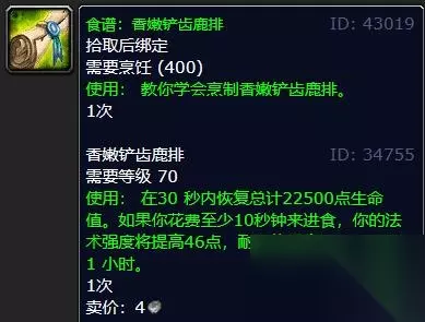 3、香嫩铲齿鹿排 拾取后绑定 需要烹饪(400) 使用:教你学会烹制香嫩铲齿鹿排。 1次 香嫩铲齿鹿排 需要等级70 使用:在30秒内恢复总计22500点生命值。如果你花费至少10秒钟来进食,你的法术强度将提高46点,耐力将提高40点,持续1小时。 1次 卖价:4