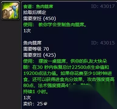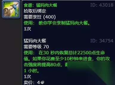 2、猛犸肉大餐 拾取后绑定 需要烹饪(400) 使用:教你学会烹制猛犸肉大餐。 1次 猛犸肉大餐 需要等级70 使用:在30秒内恢复总计22500点生命值。如果你花费至少10秒钟来进食,你的攻击强度将提高80点,耐力将提高40点,持续1小时。 1次 卖价:4