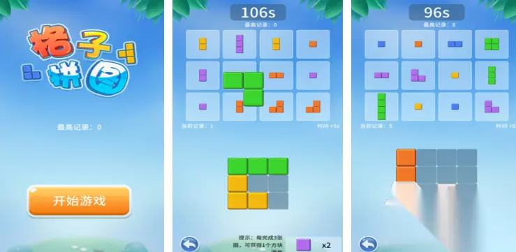 在情侣叠叠乐游戏里,除了常规的堆叠高度挑战,还有多样化的趣味模式,心跳加速模式规定时间内完成堆叠,随着倒计时临近,心跳音效加快,紧张氛围拉满,考验情侣在压力下的协作能力,创意拼图模式则是给出一个爱情主题的拼图轮廓,情侣通过堆叠不同形状的碎片来完成拼图,激发创意与想象力,为游戏增添别样乐趣。 高速下载 普通下载 8、《格子拼图》