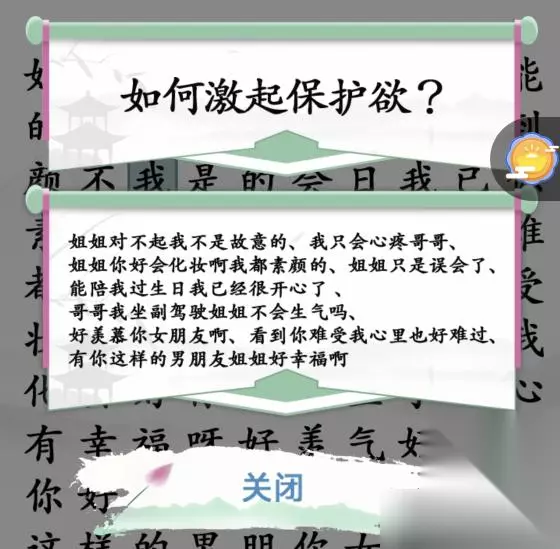 2、已经开始生气了,直接给出答案吧,时间不够可以观看广告加时 姐姐对不起我不是故意的、我只会心疼哥哥、姐姐你好会化妆啊我都素颜的、姐姐只是误会了、能陪我过生日我已经很开心了 哥哥我坐副驾驶姐姐不会生气吗、好美慕你女朋友啊、看到你难受我心里也好难过、有你这样的男朋友姐姐好幸福啊
