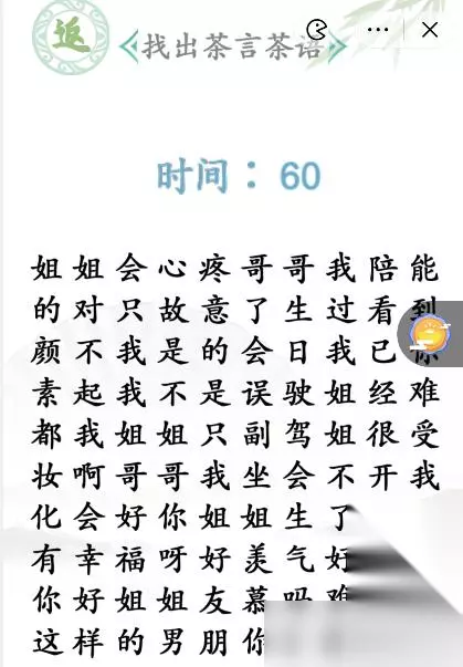 汉字找茬王是抖音上目前很火的精彩益智烧脑解谜闯关游戏,游戏中茶颜悦色找出茶言茶语怎么过?大家必须按照正确的顺序进行,否则无法过关。下面是233乐园小编给大家带来的抖音小游戏汉字找茬王茶颜悦色找出茶言茶语通关攻略,感兴趣的小伙伴们一起来看看吧。 抖音汉字找茬王茶颜悦色找出茶言茶语通关攻略 1、进入关卡我们看到许多类似我只会心疼哥哥这样的绿茶语录,我们需要连连看消除