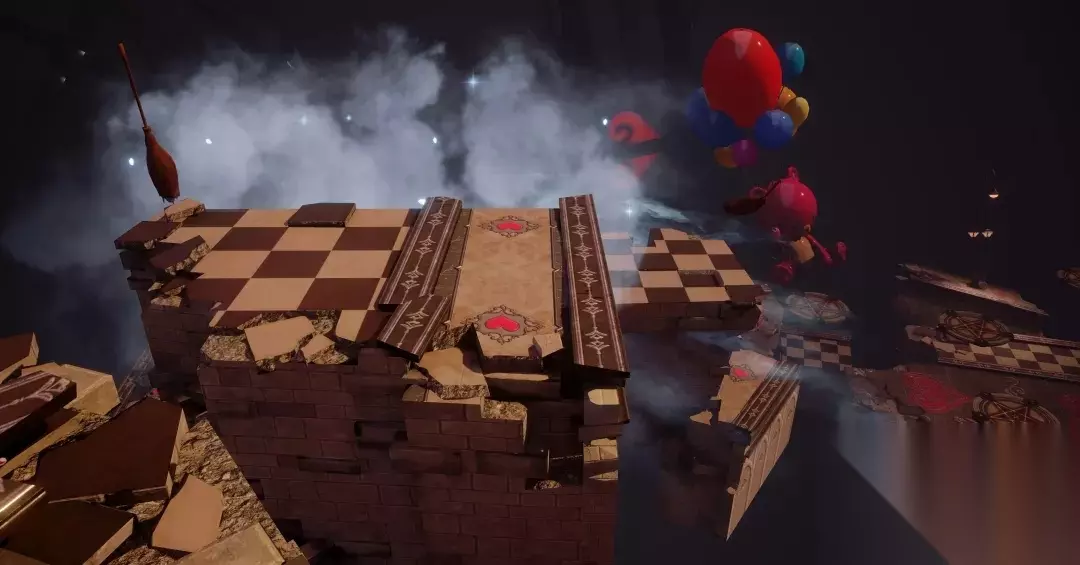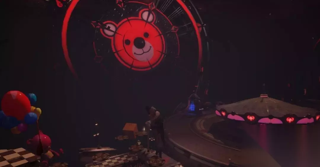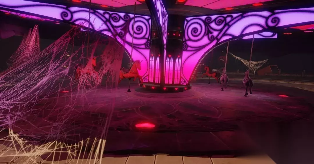 在跳跃的时候同学们要小心女巫的扫帚和拿着大摆锤的小丑。大家的一举一动都在他们的注视下,女巫的扫帚会定时施法,而当有人触碰到格子后,小丑会忽然给你来这么一下... 成功到达对岸,即可看到遍布蛛丝的旋转木马。等小队人员集齐后,一只体型庞大的蜘蛛女王会带着两个小丑女蹦到同学们的面前拦住去路。