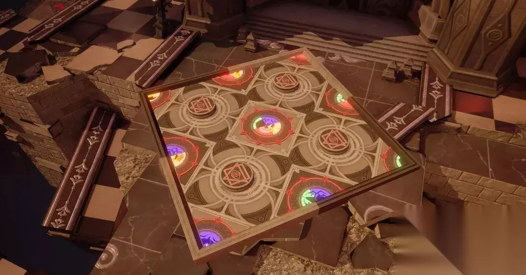 在第五关卡中大家需要在机关轴心上快速跳跃转动转盘,当转盘中心图案一致时,即可完成解谜打开城门。
