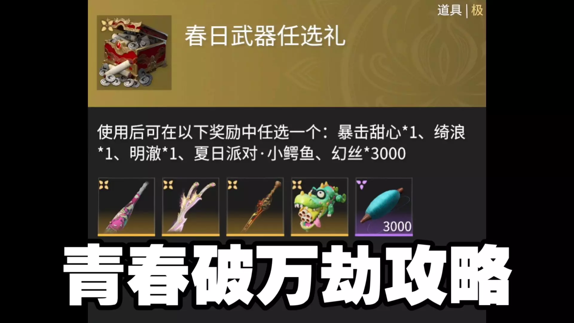领春日武器任选礼2宝灯80玉盘。青春破万劫活动攻略。省流总结,做完每日每周任务,每天蓬莱岛答题,留着自选道具第三周看情况选择劫宝球或者猫爪刀。活动时间截止3月2…
