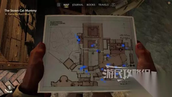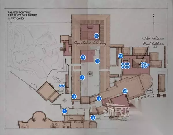 【6】知识的世界(未在上方地图标记,参考下方地图蓝色点位,需要找到隐藏在梵蒂冈的23本冒险书籍,最简单的方法是在主线推进至地图东边的梵蒂冈邮局后购买在地图上显示冒险书籍位置的书)