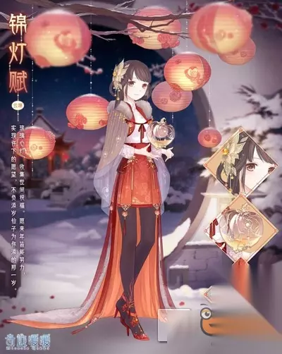 而为了迎接元旦的到来,元旦套装【锦灯赋】也首度亮相,12 月 30 日- 1 月 5 日,全服协力完成指定任务,即可点亮彩灯,开启礼盒~点亮所有彩灯即可集齐成就套装【锦灯赋】(套装有正常姿势)及奖励。