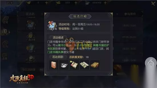 九阴真经3d门派夺书怎么玩呢,有什么玩法技巧?通过争夺书籍玩家们可以获得门派积分,下面233乐园玉米就为大家带来门派夺书技巧攻略,一起看看吧。 门派夺书玩法规则: 门派夺书的活动时间是周一到周五的19:00—19:30,需要玩家达到31级方可参加。在夺书过程中,可以通过传送前往其他门派藏书台搜集书籍,也可通过击杀偷书贼和背着书篓的玩家获得书篓,从场景传送门返回门派,找到门派书籍执事提交书籍,获得奖励。