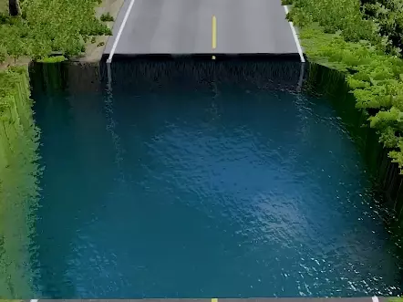 这是《车祸模拟器》的游戏实况内容,展示了多辆巴士依次行驶在有断口的道路上,先后有巴士坠入断口的水域中,呈现出游戏里的车祸模拟场景。