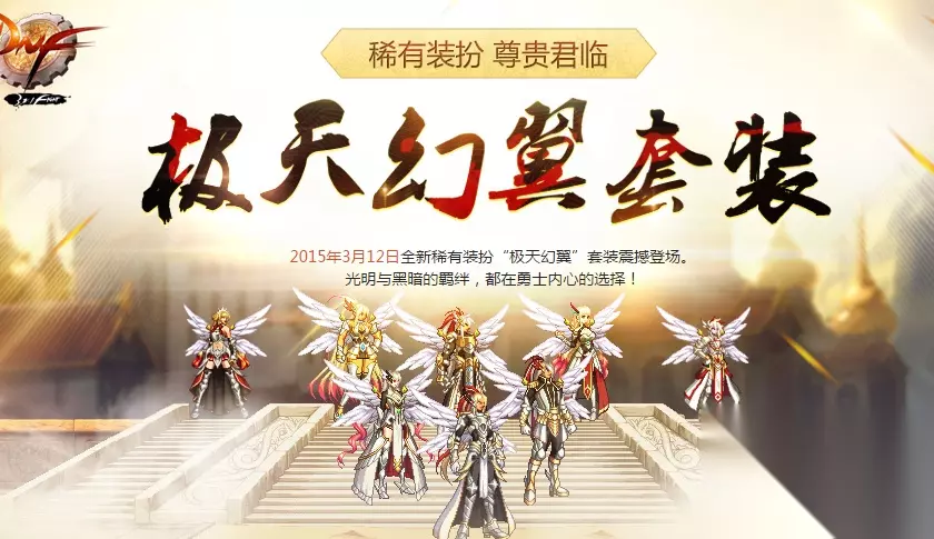 DNF极天幻翼天空套是2015年的时候国服出的天空套,这次天空套胸部时装有两种,一种是华丽的翅膀,一种是朴素的护肩装扮,害的我当时以为这是两套不一样的天空套,下面小编就给大家介绍一下DNF极天幻翼套外观,快来看看吧!