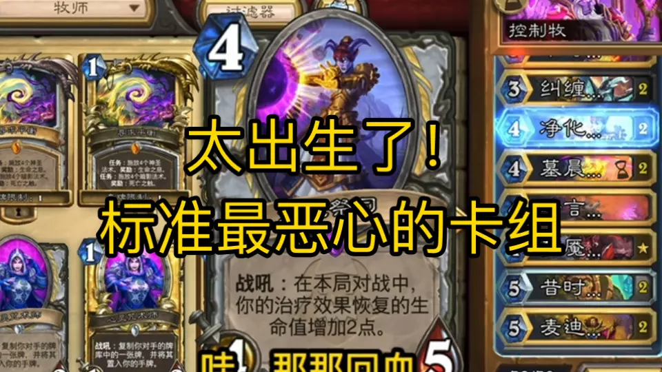 炉石传说35.0.0.237510中的一个bug,【净化祭司】无法强化飞弹类的治疗卡牌,例如【治疗之雨】和【致命诛灭】等 该bug已收录至炉石科技441期的第二个素材