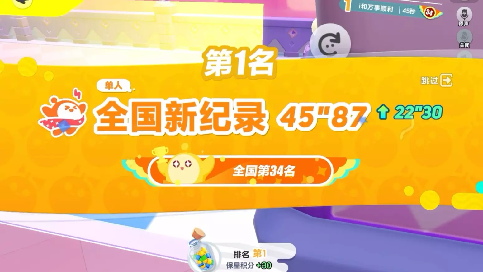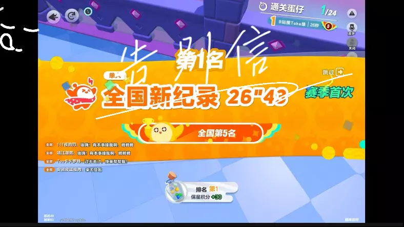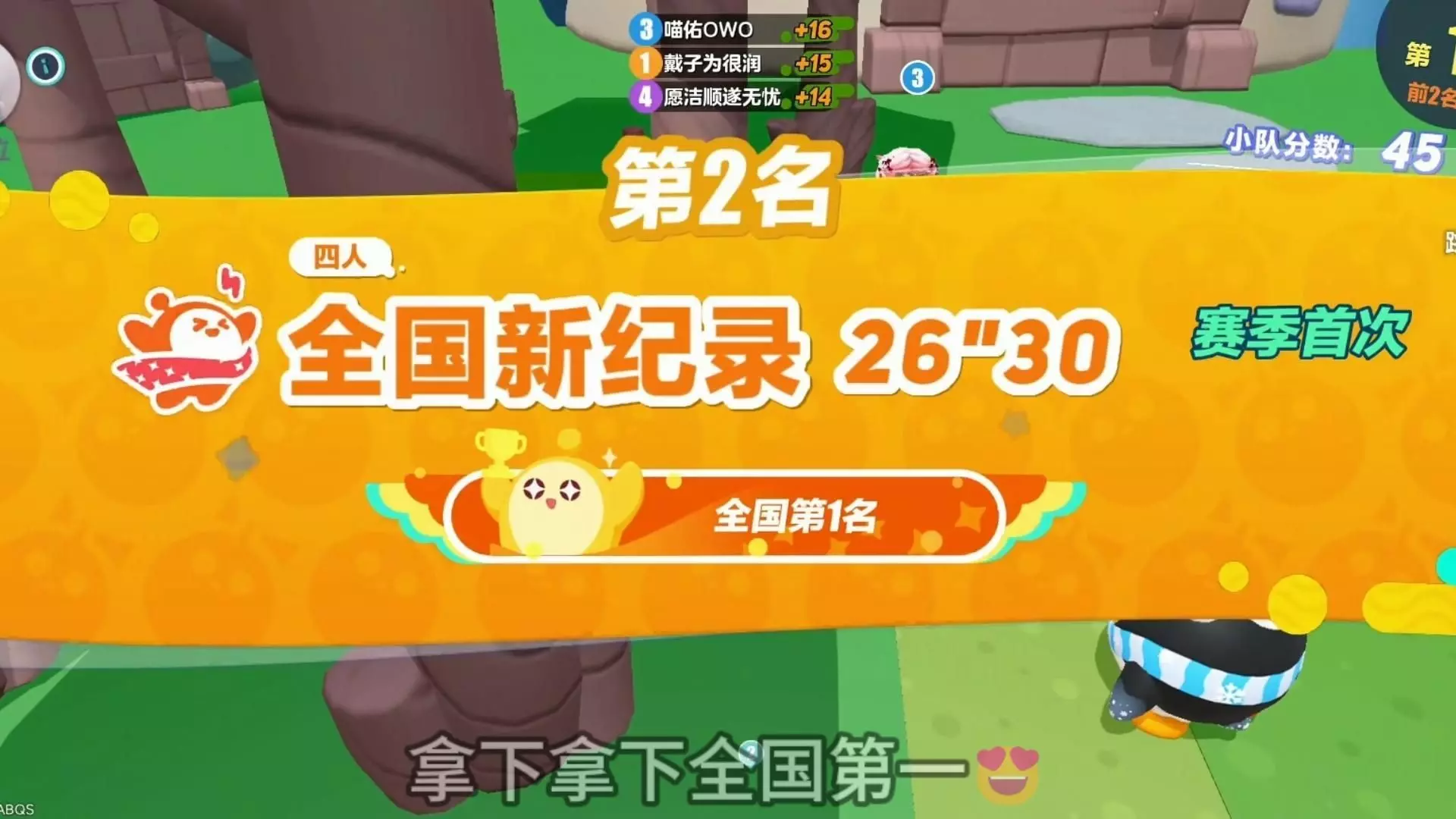 这是《蛋仔派对》的游戏内容,玩家和队友配合,在投喂甜品龙的关卡里,依靠队友的助力拿下全国第1,创下20"73的赛季首次全国新纪录,这样给力的队友十分难得。
