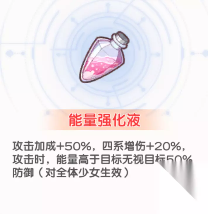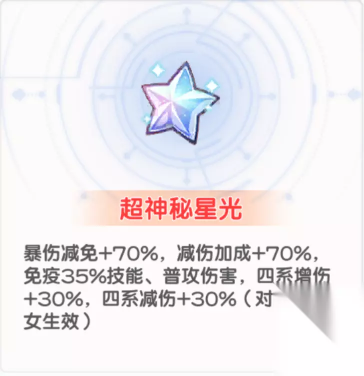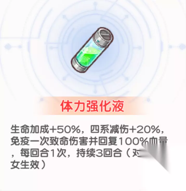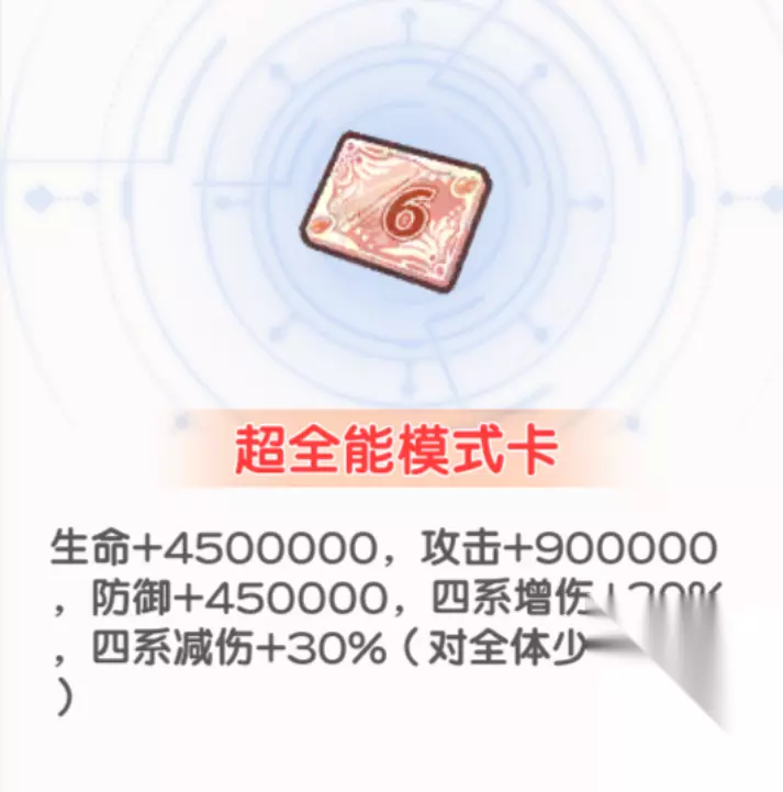 装具携带问题说明 1.为什么不带超神秘星光? 答:越到后面,越需要的是伤害 2.为什么携带体力强化液? 答:免死一次的含金量毋庸置疑 3.为什么不带临时的庇护? 答:如果遇到有光暗控制的凹到难受了的 可以将右上角的卡替换成临时的庇护 平时还是加攻击力的卡重要 最后展示一下商店没有的红色装具的属性