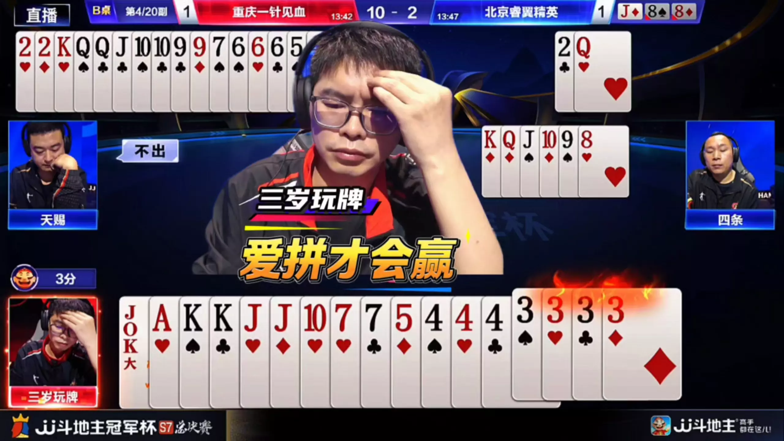 桌游棋牌 三岁玩牌破釜沉舟四个3的大胆一炸后期残局细腻的行牌为自己争取到了胜利!