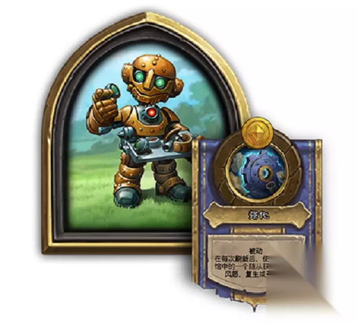 在建造模式中,增强型机器人是哥布林大战侏儒的紫色卡牌。其效果是随机使场上随从获得风怒、嘲讽和圣盾效果。当年,领域传播职业经常会带来一个。如果运气好的话可以使用风怒直接杀死所有成员,并且贴上圣盾还可以增加留在场上的能力。酒馆战棋里强化机器人的技能可以说和天梯里非常相似,只多了一个复生的效果,官方的说法是这四种强化效果出现的概率是25%,酒馆里的追随者无法获得自己已经拥有的关键词。另外,清风认为这个效果应该和伊瑟拉、晨拥一样,每回合的自然刷新也能触发效果,这样在开始游戏时3次充能就能得到一个带有强化效果的随从。
