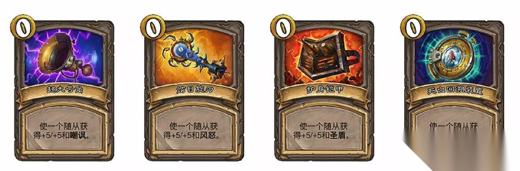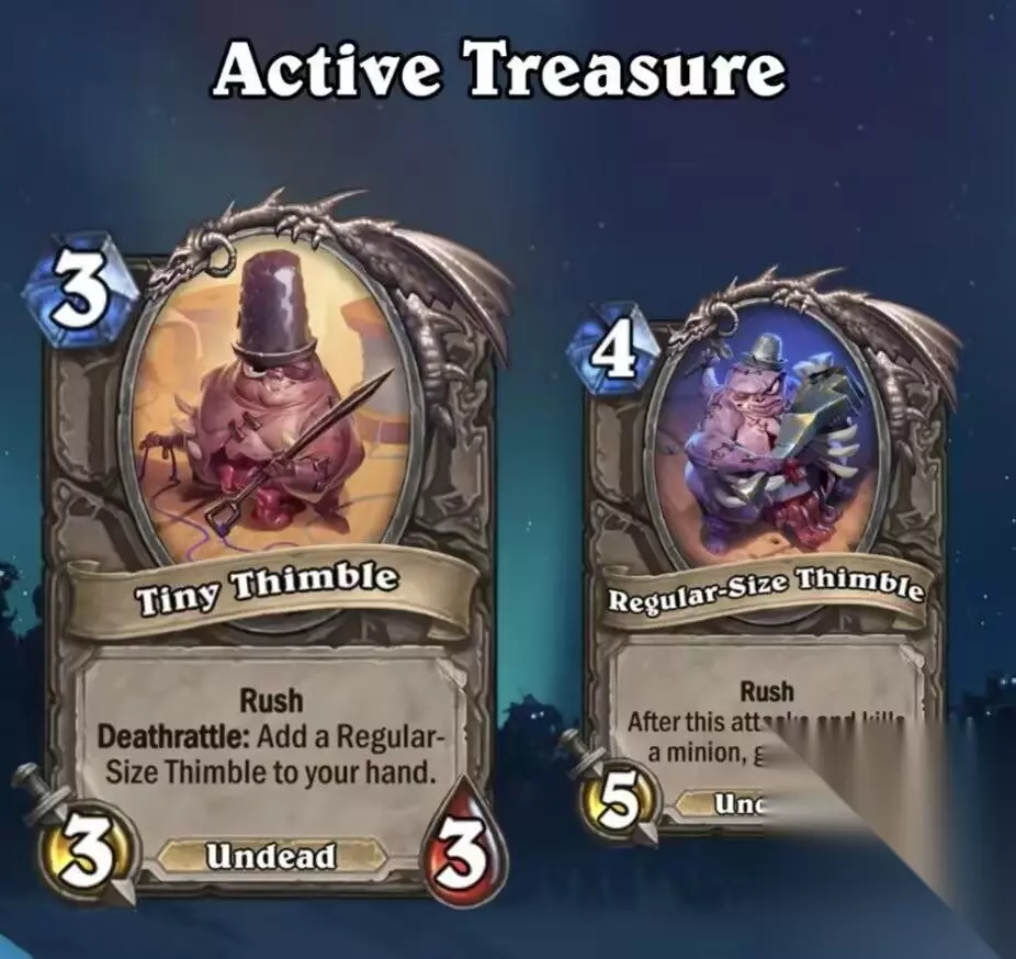 当然设计师还为死亡骑士设计了一些新的宝藏,比如可以额外获得尸体的收尸者、吃尸体时可以回复血量的血盾、吃尸体时可以召唤团队随从的食尸鬼冲锋、属性等于一半的“复活新郎”每回合结束时的尸体“逃婚联军。不过清风觉得最搞的宝藏还得是小小顶针,这个名字本身就已经很让人蚌埠住了,卡图原画里还只有一只眼睛,也许我们可以给他起个绰号……”