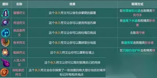1、藤蔓符文 过图顺序:地牢-有罪者大道(大道右侧第一个藤蔓边)。进入光门,击败不死弓手获取 2、传送符文 过图顺序:地牢-猛毒下水道。(找到被困者,接受任务击败精英怪获取) 3、牧羊符文 震地)过图顺序:地牢-有罪者大道-藏骨堂。(藏骨堂位置在有罪者大道最右边,通过传送石碑开门,进入藏骨堂后击杀精英怪获取,另外,获取此符文需事先获取传送符文) 4、蜘蛛符文(爬墙) 过图顺序:地牢-猛毒下水道-旧下水道-作呕地窖(boss)-沉睡的庇护所(击杀庇护所精英怪获取) 5、探险符文(雷达) 击败遗忘墓陵精英怪获取,过图顺序:地牢-猛毒下水道-旧下水道-作呕地窖(boss)-沉睡的庇护所-被遗忘的墓陵 6、挑战者符文(解锁每日挑战) 击败黑色大桥boss守卫者获取 7、人造人符文(飞头) 击败王座之间boss国王之手获取 以上就是游戏中符文获取的方式,每个符文的作用和获取的方法都是不同的,大家可以根据以上介绍中的方法去游戏中寻找符文。