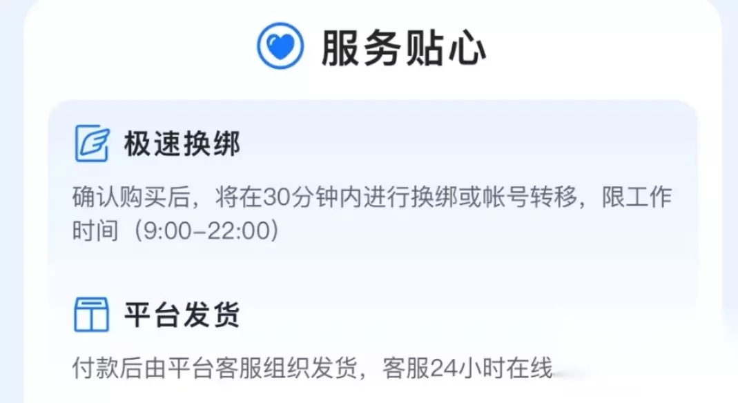 为什么交易猫买号很方便呢?那是因为平台支持极速转移资料,要求带有极速转移保障的账号在工作时间段都要在30分钟左右把资料转移完毕。处理资料转移流程的人员都是非常专业的,不会在转移的过程中泄露大家的资料,更不会发生盗号这样的事情。