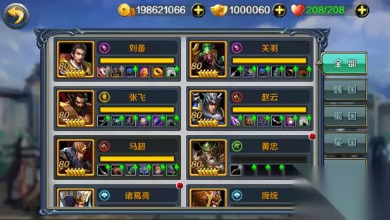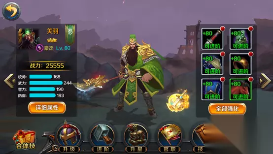 在这里,玩家可以对武将进行升级、升星、进阶、技能升级、装备强化和精练、查看详细信息等操作。 武将出阵