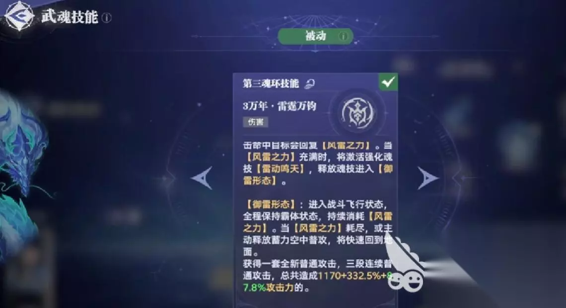 蓝电霸王龙一旦施展技能之后,可以实现大范围内的多段伤害,如果它的魂环经过强化之后,段数肯定会得到提升,而它的目标爆伤也会随之增加。如果蓝电霸王龙施展奥义技能,也就是直接从高空砸到地面,这样就会形成一定的范围内的伤害。而当它解锁了第四魂环以后,追加落雷攻击。此时它的风雷之力将会提升,并且还会触发二段高额的伤害。
