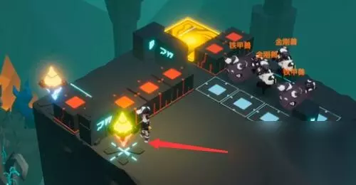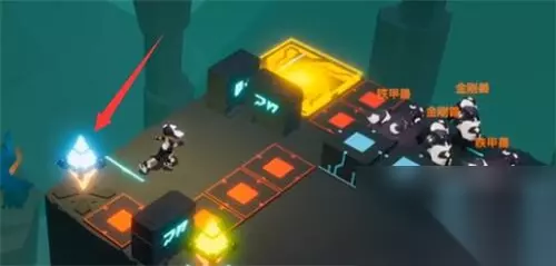 3、开启机关,把中间的升降机降下去,再走到左边开启蓝色的机关,把怪围在里面。(如下图)