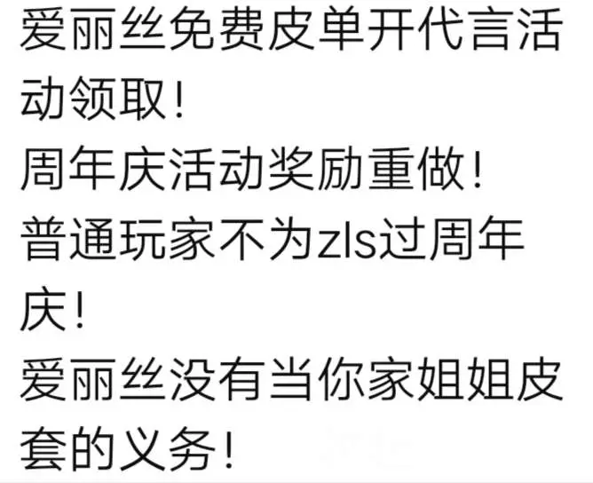 就拿那个周年限定皮来说吧。刚联动没多久,你就发公告说是赵露思的联动皮,你知道这个皮肤让员工期待了多久吗?你有没有想过不一定所有的员工都是赵露思的粉丝?有没有考虑过非可露丽的感受?这个皮肤还是爱丽丝的,超自然你想干啥?爱丽丝不是大众的角色,你把这个设置成爱丽丝的皮肤是想让它吃灰吗?
