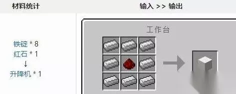 升降机方块不能直接放在空中,所以最好用方块搭建一下。一旦两个升降机方块被放置好了以后,玩家只要站在方块上按跳跃键就是向上传送,按shift就是向下传送,传送过程中不会因为两个升降机方块只有有方块而不能运作。 升降机的合成非常简单,只要八个铁锭和一个红石就可以了。
