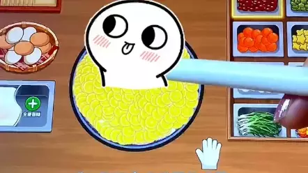 这是模拟经营游戏《我的煎饼摊》的玩法展示,玩家在游戏中用食材在摊盘上拼出图案,过程中还结合表情包互动,呈现出趣味的煎饼制作模拟体验。