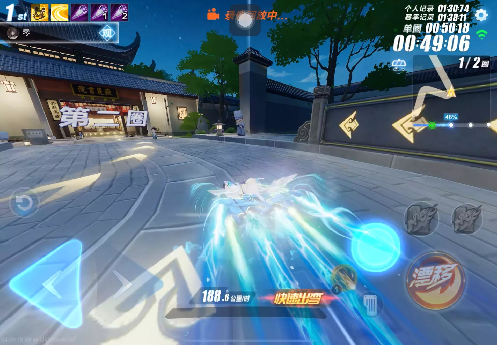 这是QQ飞车的游戏录像回放,玩家分享了自己的赛车对局,吐槽自己的起步被使用,还觉得前8个氮气的速度不如青耀cw快,画面中展示了赛车使用CW喷、氮气延续等操作完成赛道竞速的过程。